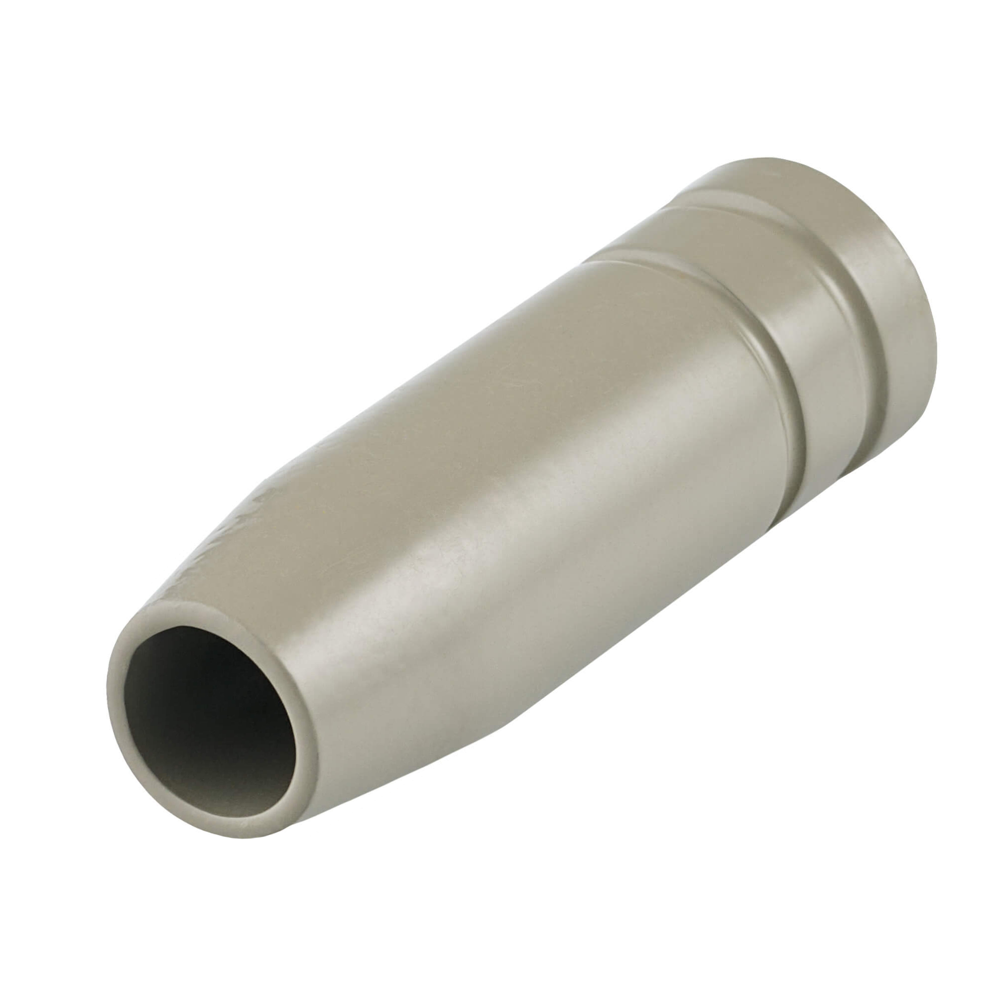 Газораспределительное сопло с керамическим покрытием для полуавтоматических горелок MIG MP 15 всех серий. Выходной внутренний диаметр сопла 9,5 мм. Сопло используется для равномерного распределения газового потока и для защиты сварочного наконечника от механического воздействия или случайного соприкосновения со свариваемым изделием.Сопло изготовлено из меди, сверху нанесён керамический слой, который работает как электрический и термический изолятор поверхности.Керамическое покрытие наносится специальным технологическим процессом, образуется гомогенный ровный слой, рассчитанный на промышленную эксплуатацию такого газораспределительного сопла. Керамический слой состоит из броннитрида (бор нитрид, BN).Отличительная особенность сопла CRM1595 – это керамическое покрытие:Керамическое покрытие создаёт термобарьер, так как керамика выдерживает очень высокие температуры, не расплавляется и не деформируется.Покрытие препятствует прилипанию сварочных брызг за счёт очень гладкой поверхности. Брызги либо отскакивают, либо слабо держатся и легко счищаются.Из-за отсутствия налипших брызг металла формируется более стабильный газовый поток и дуга. Увеличивается продолжительность работ без остановки и последующей очистки сопла и комплектующих для горелки MIG.Керамический слой заметно увеличивает ресурс сопла и расходных частей сварочной горелки.Область применения сопел с керамическим покрытием:Узкощелевое сваривание труб, толстых стенок. Орбитальная сварка, где сопло или наконечник может задеть стенку свариваемого изделия. В таком случае керамическое покрытие выступает в роли диэлектрика, защищает от коротких замыканий, снижает риск «поджигания» дуги по боковой стенке и медных включений в металл шва.Сварка порошковой проволокой, где нужно увеличить токи и скорость без потери качества корня.Автоматизированные линии и роботизация, где критичны длительные остановки рабочего процесса и присутствует минимальное обслуживание сварочных горелок.